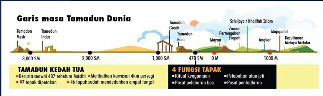 Gambar ini menunjukkan garis masa tamadun dunia dan kedudukan Tamadun Kedah Tua yang wujud seawal 487 Sebelum Masihi. Tamadun ini meliputi kawasan seluas 4km persegi dengan 97 tapak telah dipetakan dan 46 daripadanya mendedahkan empat fungsi utama iaitu ritual keagamaan, pusat peleburan besi, pelabuhan atau jeti, dan pusat pentadbiran. Ini membuktikan Tamadun Kedah Tua setanding dengan tamadun besar lain seperti Mesir, Indus, Greek, Rom, dan Srivijaya.
